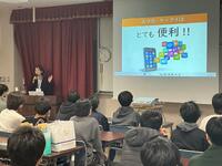 講義の後には、本校情報担当教員より、タブレット端末の操作方法やアプリの使用ルールについて説明が行われました。タブレット端末は授業だけでなく家庭でも使用できる便利な反面、夜間帯の使用や持ち帰りに伴う紛失・情報漏洩などのリスクもあります。パスワード管理の重要性や、使用場所・時間に配慮した取り扱いについて、生徒たちは真剣な表情で話を聞いていました。